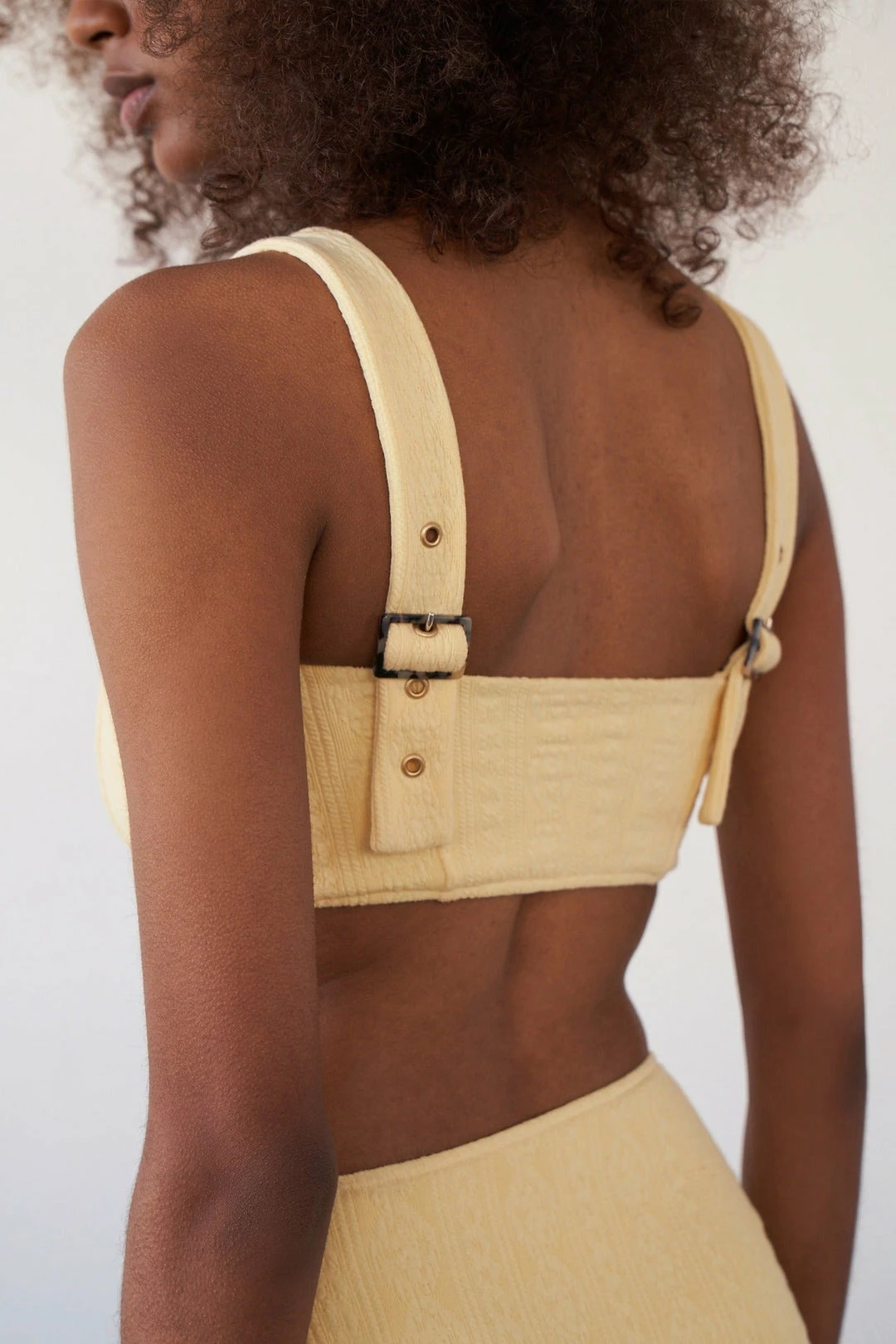 Hunter Top makes a statement with its clean lines and unique buckle straps. This top features topstitch detailing and boning at the sides for added structure. The straps are adjustable with grommets and tortoise shell buckles.