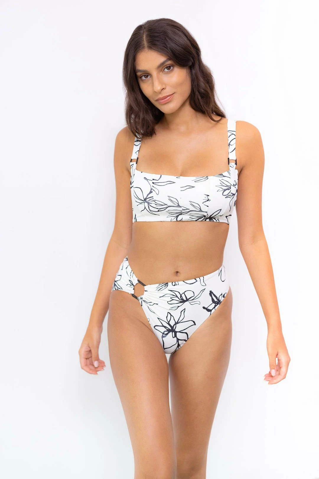 The Logan bottom is mid-rise with moderate coverage. The asymmetrical designed front features a beautiful custom metal trim piece.